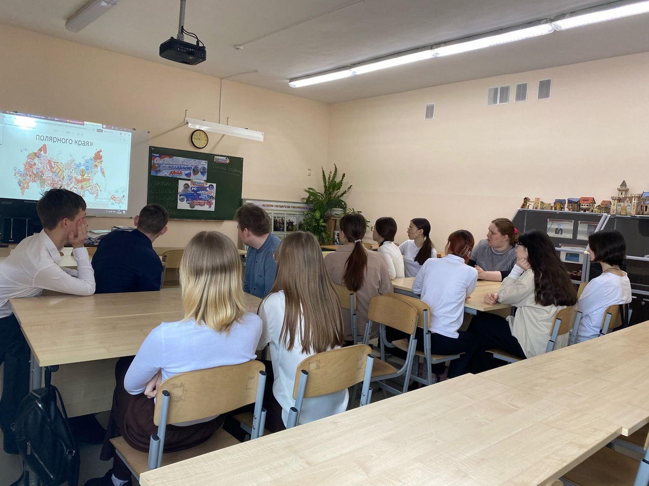 Учащиеся просмотрели видеоролик про регион. После его просмотра обучающиеся продолжили расширять знания о достижениях своей области. Разговор проходит в рамках о достопримечательностях родного края, знаменитых людях, героях, сопровождается выполнением интерактивного задания «Мы гордимся!» Содержание задания: ребята по группам получили подготовленные карточки, на которых представлена информация по направлениям: «Образование и наука», «Туризм», «Культура», «Промышленность», «Спорт», «Строительство». Каждая группа приготовила минутный репортаж об уникальности и достижениях своего края по своему направлению, начиная со слов – «Мы по праву можем гордиться Тюменской областью ...». Учащимся был предложен видеоролик о достижении региона на выставке-форуме «Россия», которая проходит в Москве. Также один из учеников класса, побывав недавно на выставке, поделился впечатлениями. Наш край, безусловно, для нас самый лучший, любимый и родной! Но поверьте, что любой другой регион России от южных морей до полярного края, тоже по-своему прекрасен и уникален, и каждому региону есть чем гордиться! Как пазл складывается из разных кусочков, так и наша страна складывается из разных регионов. Смотря на вышитую карту России, мы видим, как изумрудно-зеленые леса, ярко-синие реки, солнечно-желтые 11 пашни, ослепительно-белые снежные равнины, соединяются одной красной нитью – нашей любви к Родине. Несмотря на то, что мы все разные, по-своему, уникальные и необычные, все мы едины в своей любви к нашей великой стране.